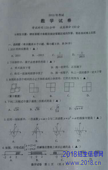 2015年辽宁省锦州市中考数学试题(扫描版,无答案)