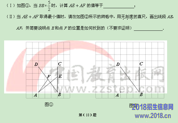 (18)如图,在每个小正方形的边长为1的网格中,点A, B, C, D均在格点上,点E, F分别为线段BC,DB上的动点,且BE =DF.