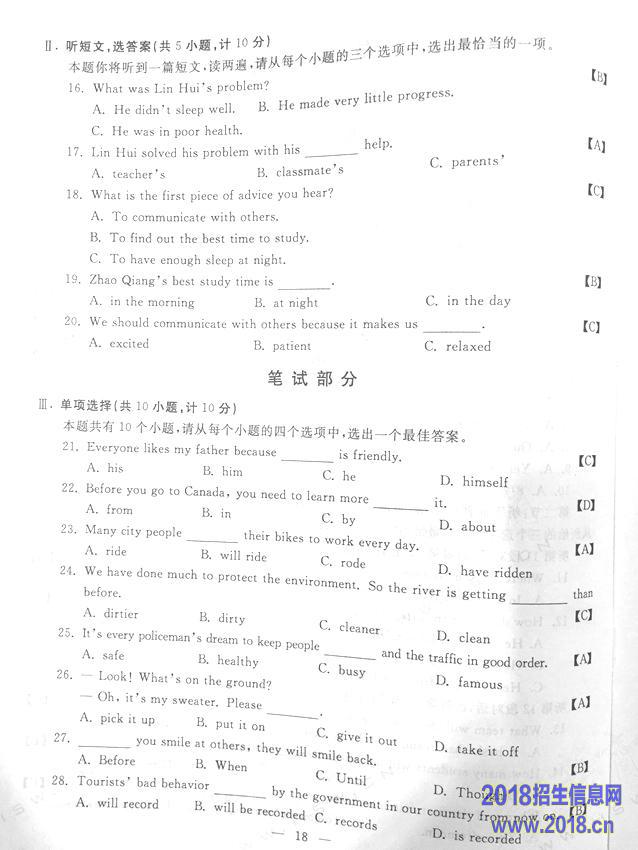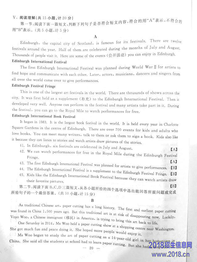 第二节:阅读下面B、C、D三篇短文,从各小题所给的四个选项中选出能回答所提问题或完成所给句子的一个最佳答案。(共10小题,计15分)