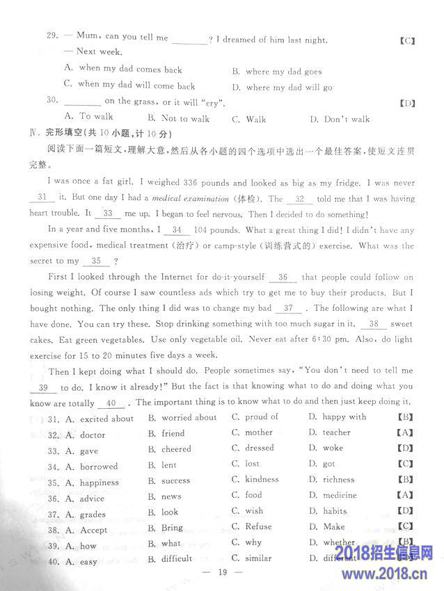 I was once a fat girl . I weighed 336 pounds and looked as big as my fridge. I was never 31 it. But one day I had a medical examination(体检). The 32 told me that I was having heart trouble. It 33 me up. I began to feel nervous. Then I decided to do something!