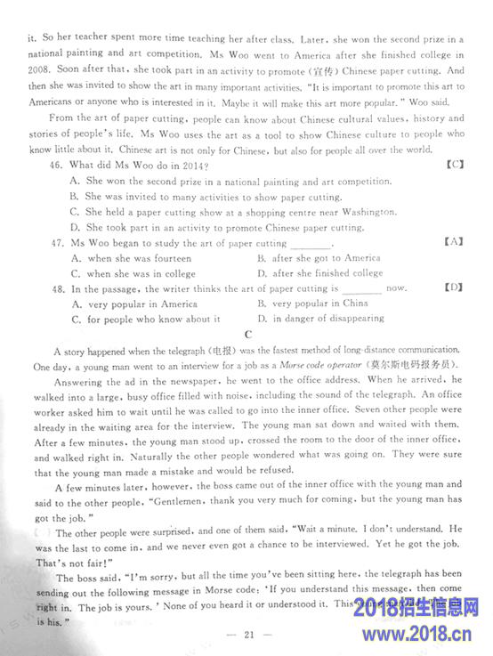 A few minutes later, however, the boss came out of the inner office with the young man and said to the other people,“Gentlemen,thank you very much for coming, but the young man has got the job.”