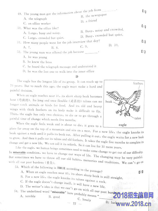 Like the eagle, we human beings sometimes need to make some change to get out of our difficulty. In miserable condition, we have to change our ways of life. The changing may be very painful. But sometimes we have to throw off our old habits, memories and traditions. We can’t go on with all our past burdens(重负).