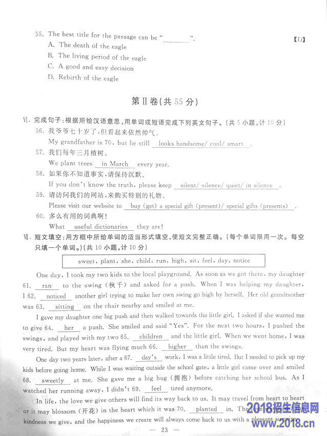 One day, I took my two kids to the local playground. As soon as we got there, my daughter 61 to the swing(秋千)and asked for a push. When I was helping my daughter. I 62 another girl trying to make her own swing go high by herself. Her old grandmother was 63 on the chair nearby and smiled at me.