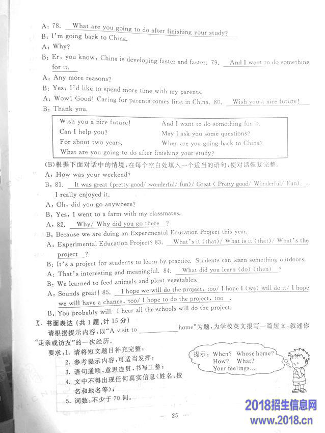 (A)根据对话内容,将方框内符合对话情境的句子抄写在对话空白处,使对话恢复完整,选项中有两项是多余的。