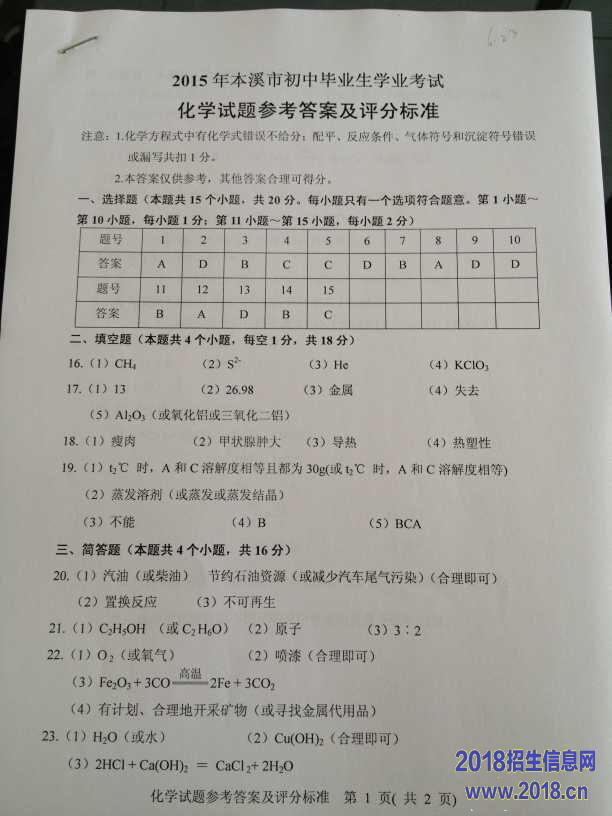 2015年辽宁省本溪市中考化学试题(word版,含答案)