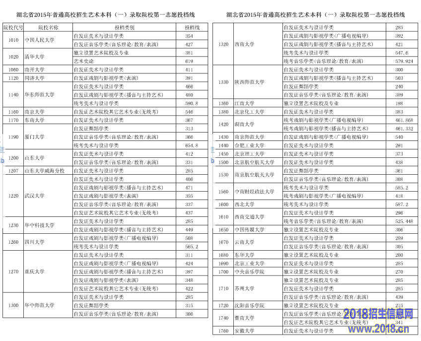 2015湖北高考艺术本科一院校投档线(第一志愿)