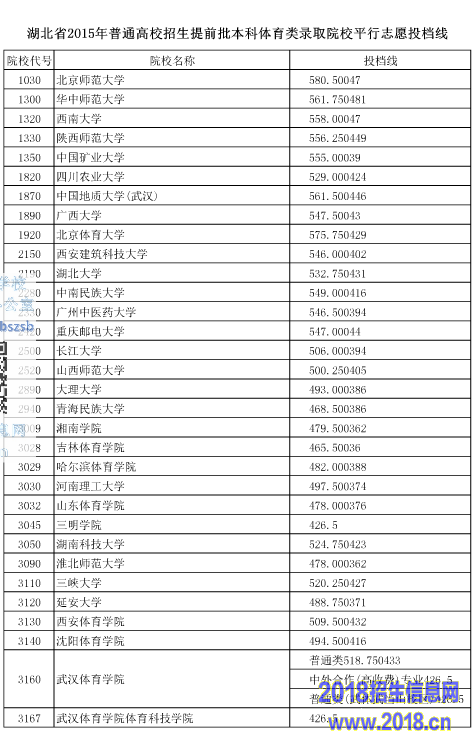 湖北省2015年提前批本科体育类录取院校平行志愿投档线