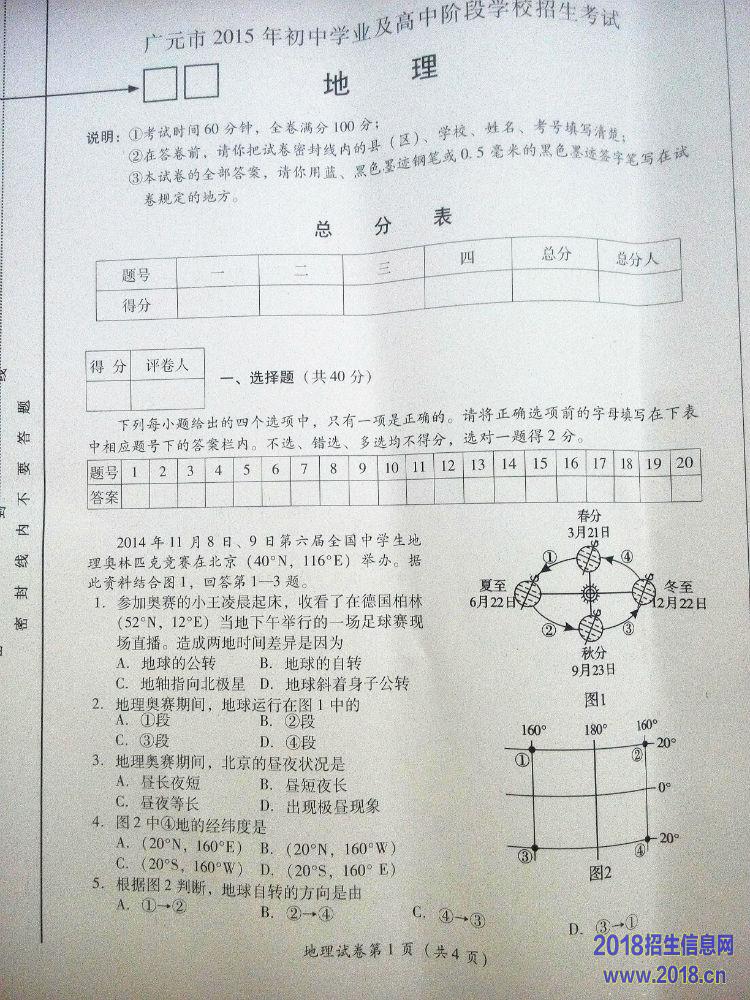 2015年四川省广元市中考地理试题(扫描版,含答案)
