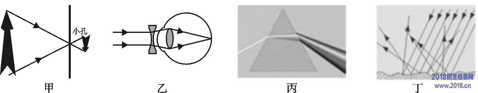 C.图丙中,光的三原色是红黄蓝 D.图丁中,漫反射不遵