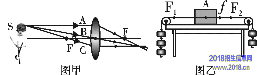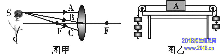 20.(6分)(1)如图甲所示,是一束菊花的花顶S反射出的三条特殊光线SA、SB和SC。其中,SA平行于主光轴,SB经过光心,SC经过左焦点,请画出这三条光线通过凸透镜折射后出射光线。