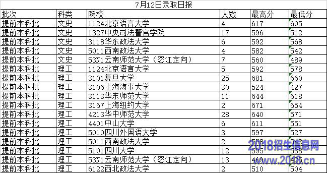 云南:2015年7月12日普高录取分数线日报