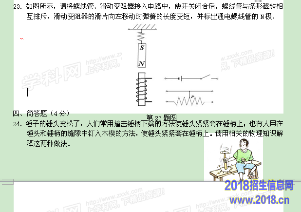 答:用撞击锤柄的方法时,锤头和锤柄一起向下运动,当锤柄停止运动,锤头由于惯性继续向下运动,使锤头紧紧套在锤柄上。-------------------------------(2分)