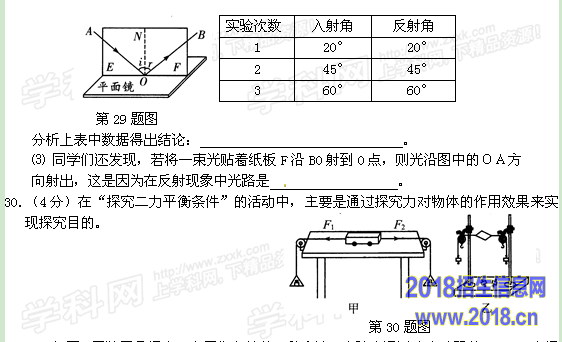 ⑴ 让一细光束沿平面E射到平面镜上的O点,在平面E上可看到入射光线AO,若将纸板F向前或向后折,在纸板F上不能看到反射光线,这说明 。