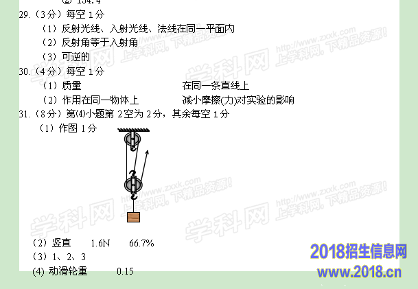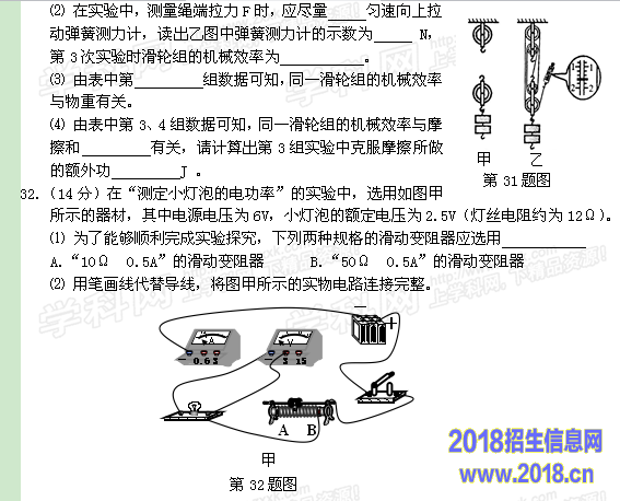 31.(8分)在探究“滑轮组机械效率”时,小强利用两组滑轮组进行了4次测量,用一个动滑轮和一个定滑轮测得前3组数据,用两个动滑轮和两个定滑轮测得第4组数据,如下表:
