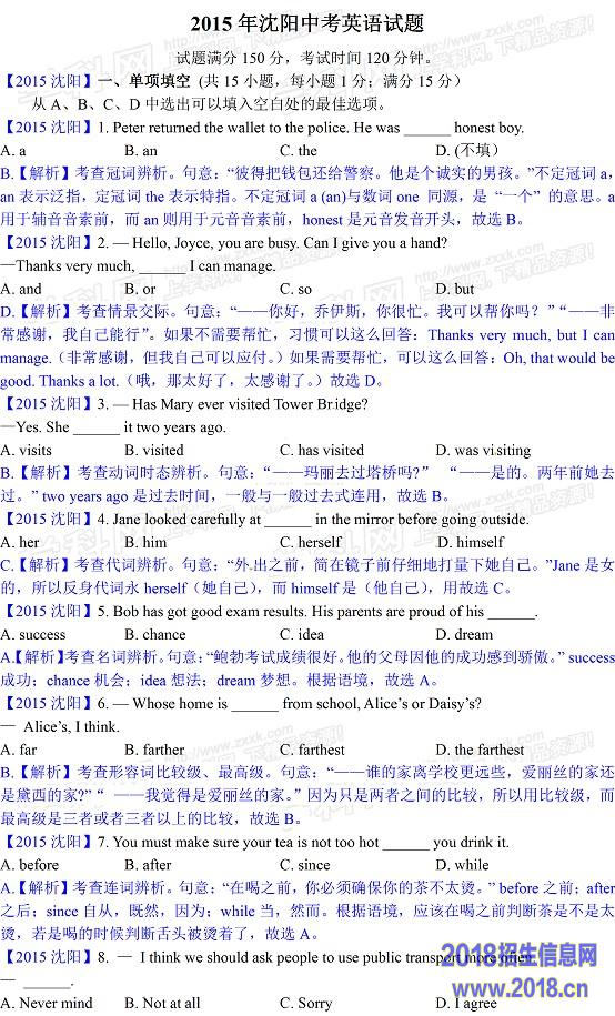 2015年辽宁沈阳中考英语试题及答案(图片版)