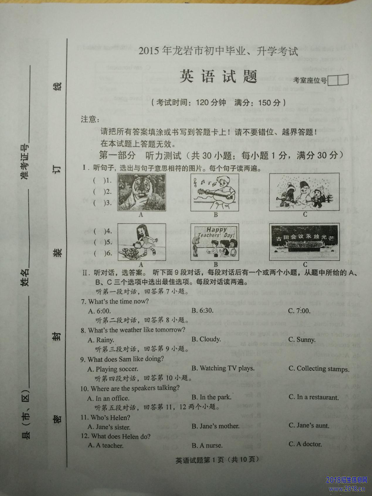 2015年福建省龙岩市中考英语试题(扫描版,含答案)