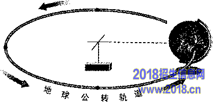 读地球公转演示图(支架顶部的十字架代表“太阳光线”),完成1〜2题。