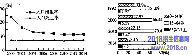 D.该山脉是我国半湿润区与半干旱区的分界线 读某地区人口出生率、死亡率变化图和人口年龄结构变化图,完成9〜10题。
