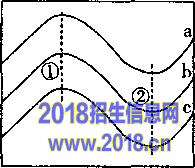 18.若三条线为等高线,则①、②两地代表的地形分别是