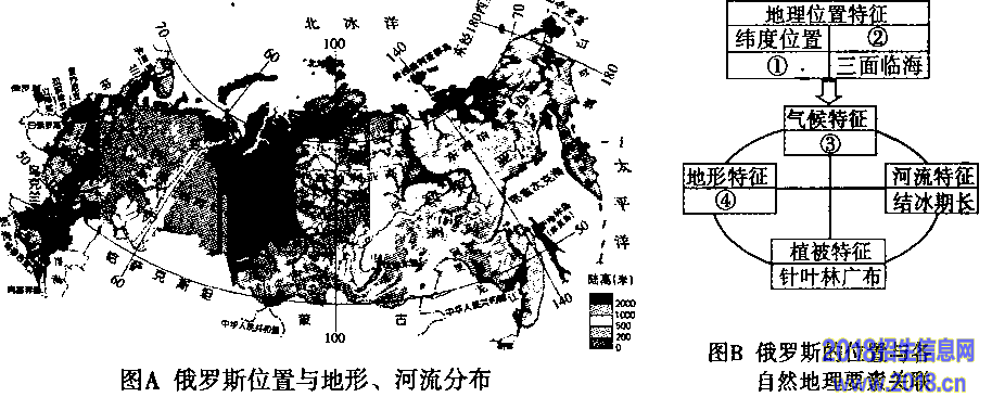 37.(8分)读图分析。图A为俄罗斯位置与地形、河流分布图,图B为俄罗斯的位置与各 自然地理要素关联图。读图完成下列问题。