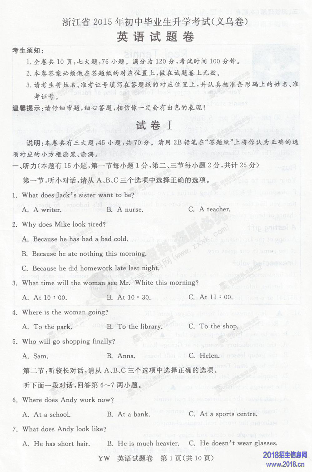 2015年浙江省义乌市中考英语试题(扫描版,含答案)