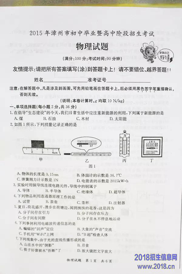 2015年福建省漳州市中考物理试题(扫描版,含答案)