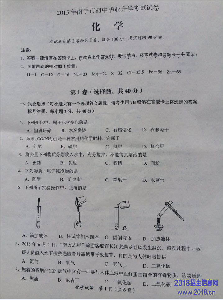 2015年广西南宁市中考化学试题(扫描版,含答案)