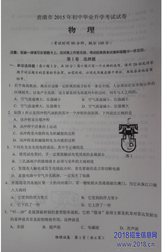 2015年广西贵港市中考物理试题(扫描版,无答案)
