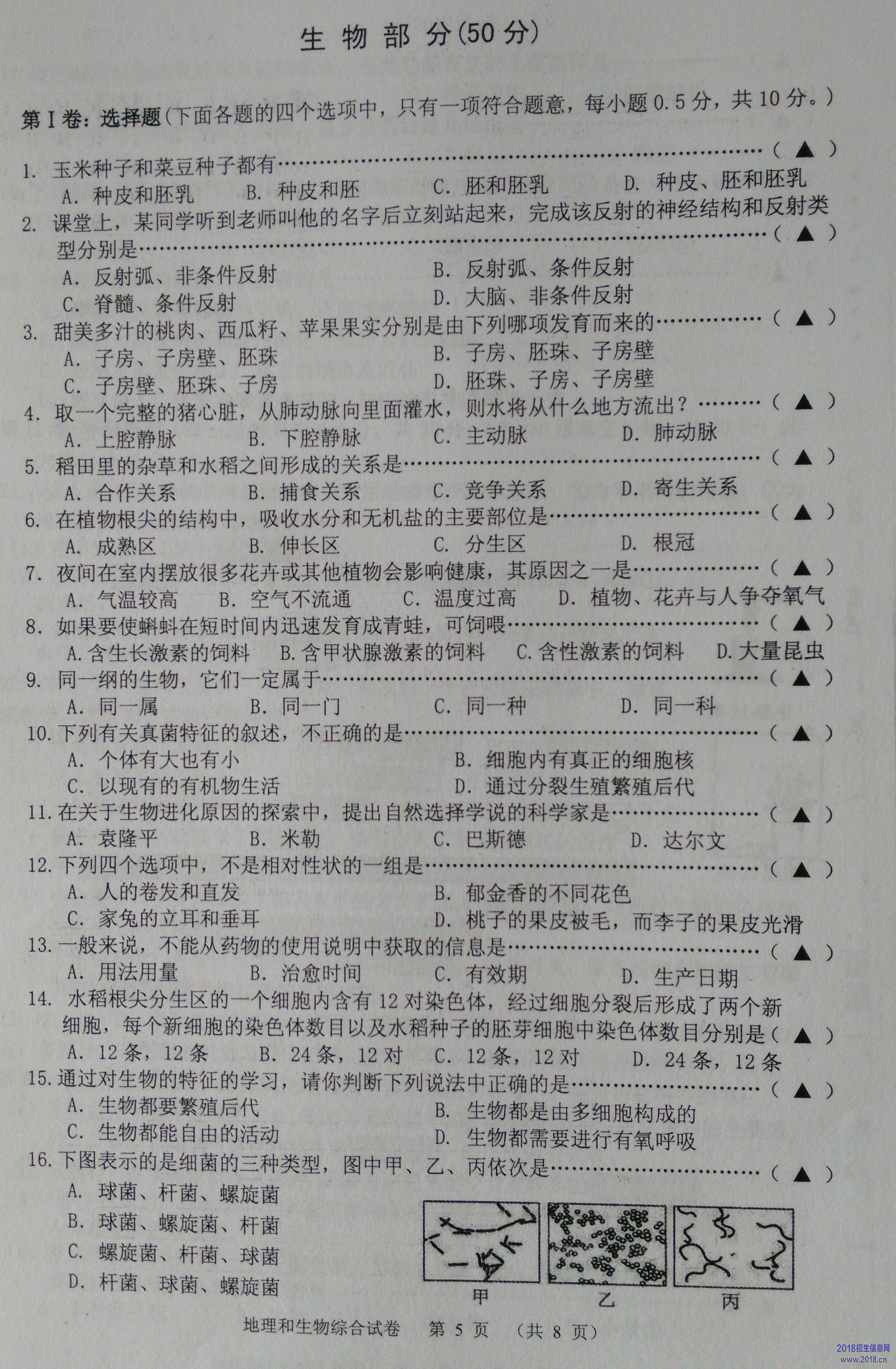 2015年辽宁省锦州市中考生物试题(扫描版,无答案)