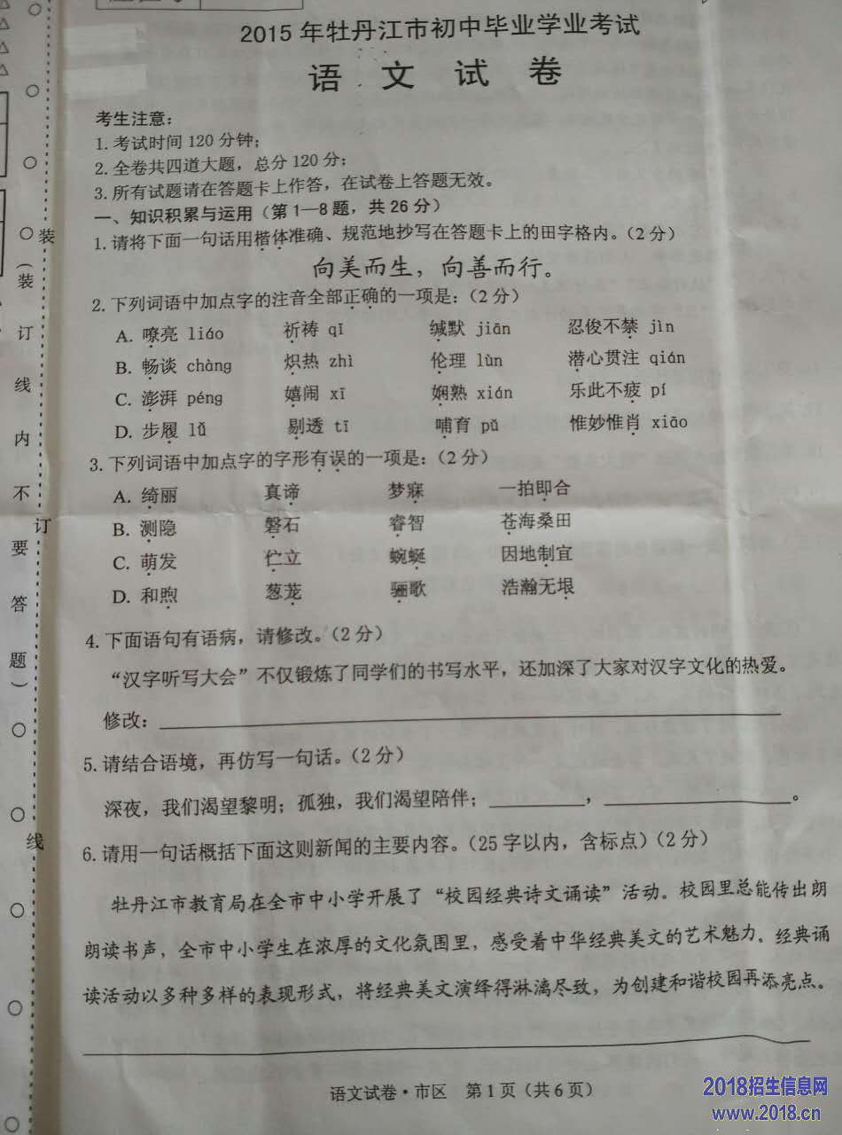 2015年黑龙江省牡丹江市中考语文试题(扫描版,含答案)