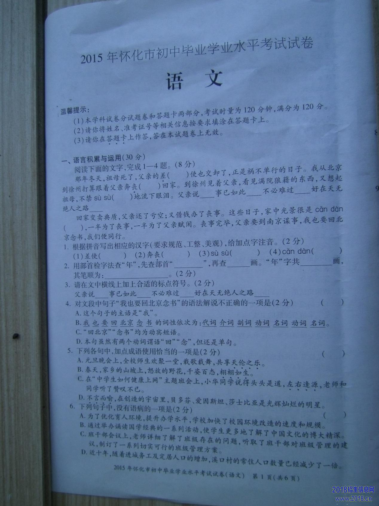 2015年湖南省怀化市中考语文试题(扫描版,无答案)