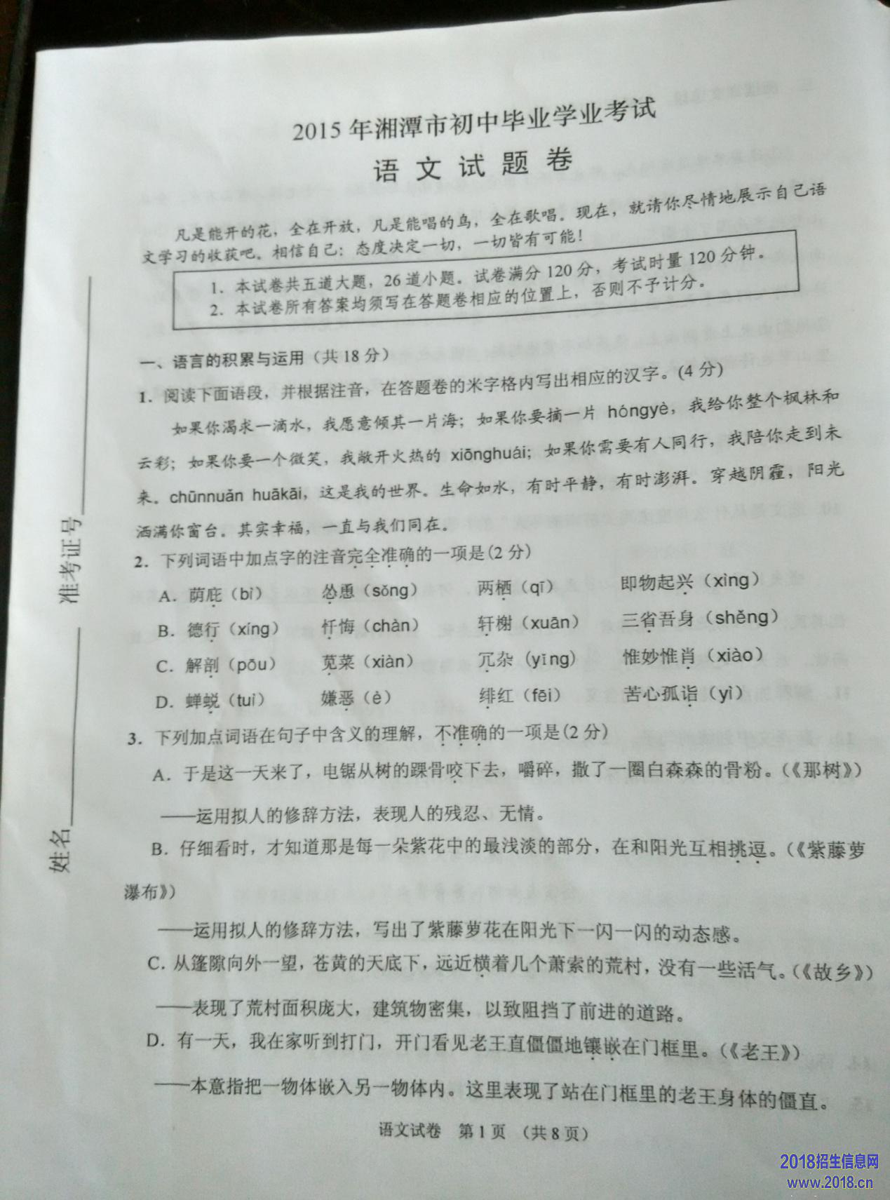 2015年湖南省湘潭市中考语文试题(扫描版,无答案)