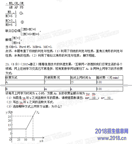 当x>50时,∵yA=0.01x+6.75,yB=0.01x+9.5,yA<yB,∴选择A方式上网学习合算,
