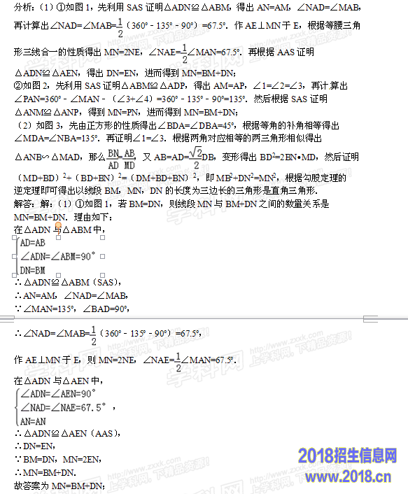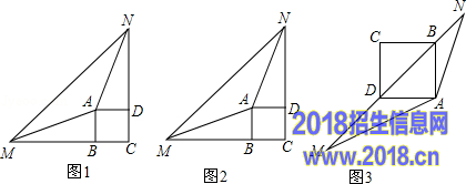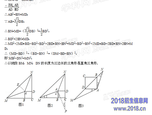 点评:本题是几何变换综合题,其中涉及到正方形的性质,全等三角形的判定与性质,平行线的性质,等腰三角形的性质,补角的性质,相似三角形的判定与性质,勾股定理的逆定理等知识,综合性较强,有一定难度.准确作出辅助线,利用数形结合是解(1)小题的关键,证明△ANB∽△MAD是解(2)小题的关键.