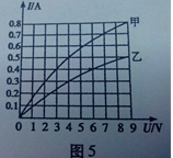 13.甲、乙两灯的额定电压均为9V,测得其电流与电压变化的关系图像如图5所示,则乙灯正常发光时的电阻是 Ω;若将甲、乙两灯串联接入9V的电路中,通电1min,两灯消耗的总电能为 J。