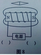 16.如图8所示,请你根据通电螺线管的N、S极,标出小磁针的N极,通电螺线管的磁感线方向以及电源的正负极。