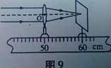 ⑴如图9所示,让太阳光正对着凸透镜照射,把光屏置于另一侧。改变光屏与凸透镜的距离,直到光屏上出现一个最小最亮的光斑,测得凸透镜的焦距是 cm。