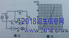 23.(4分)如图13所示,电源电压U=12V,R1为定值电阻,阻值为24Ω,R2为滑动变阻器,R2为滑动变阻器,R2最大阻值为48Ω,小灯泡标有“6V 3W”字样,小灯泡的U-I关系如图14所示。求: