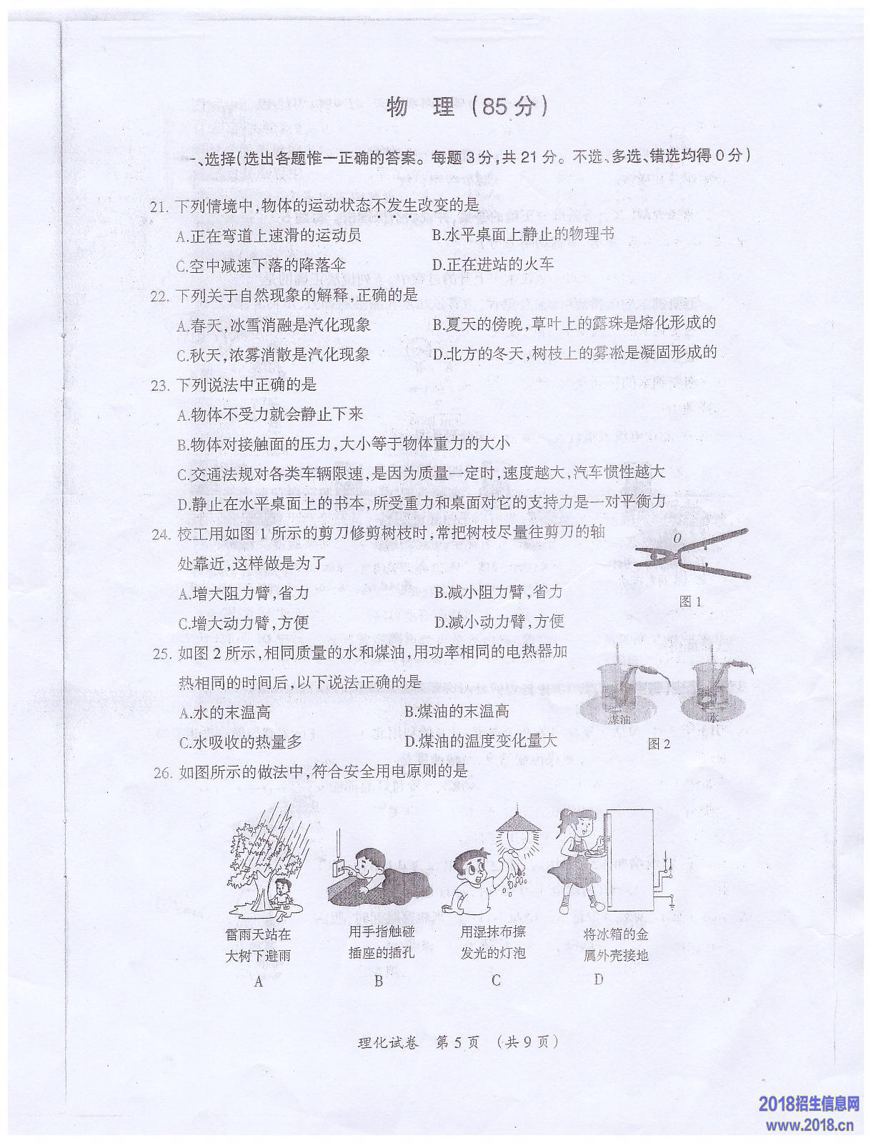 2016年巴中中考理综试题及答案