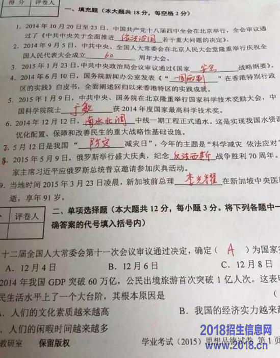 2015年上海市初中学业考试政治试题(扫描版,无答案)