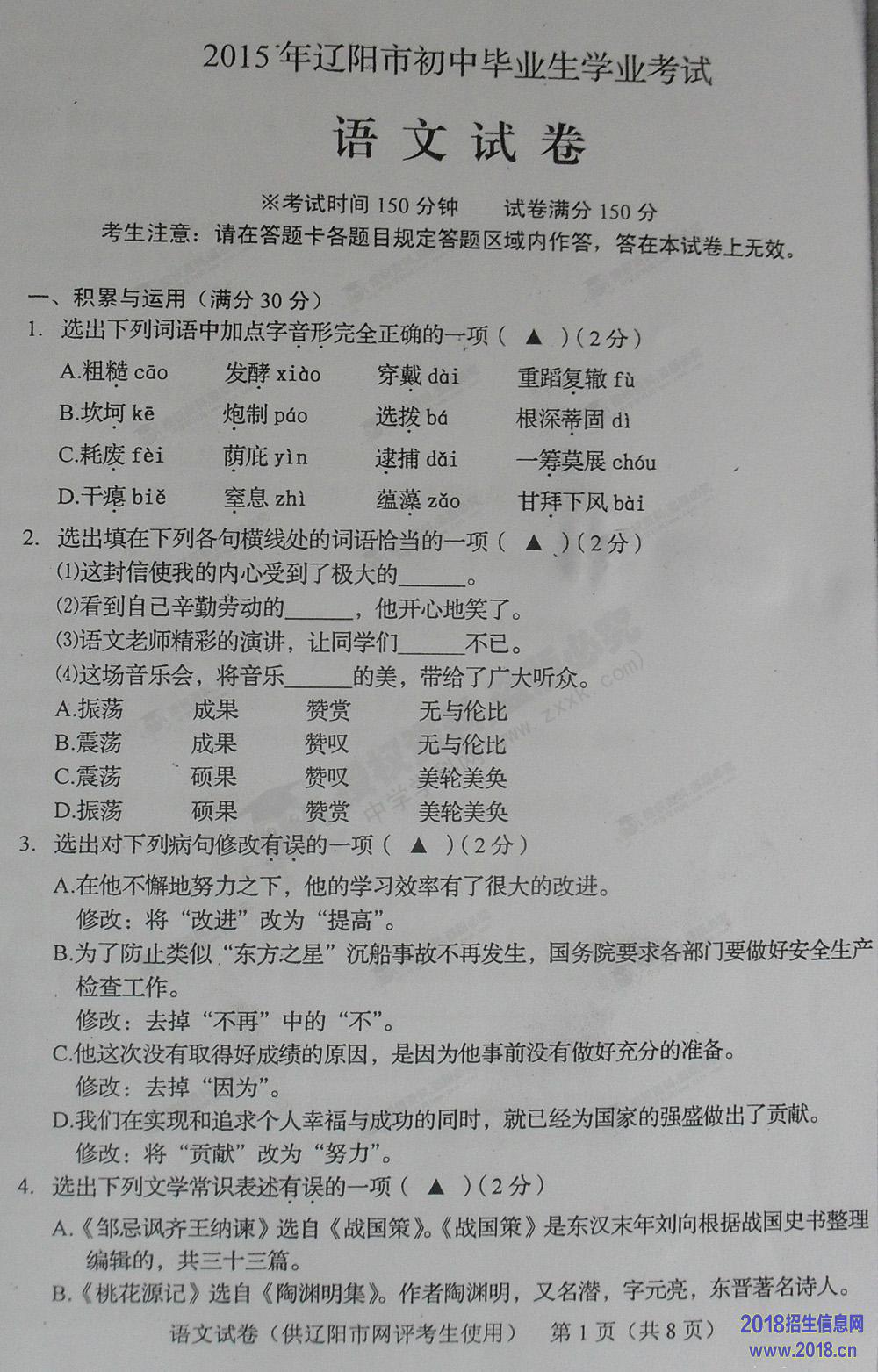 2015年辽宁省辽阳市中考语文试题(扫描版,含答案)