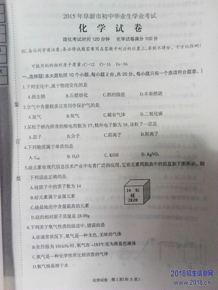 2015年辽宁阜新中考化学试题(图片版,无答案)