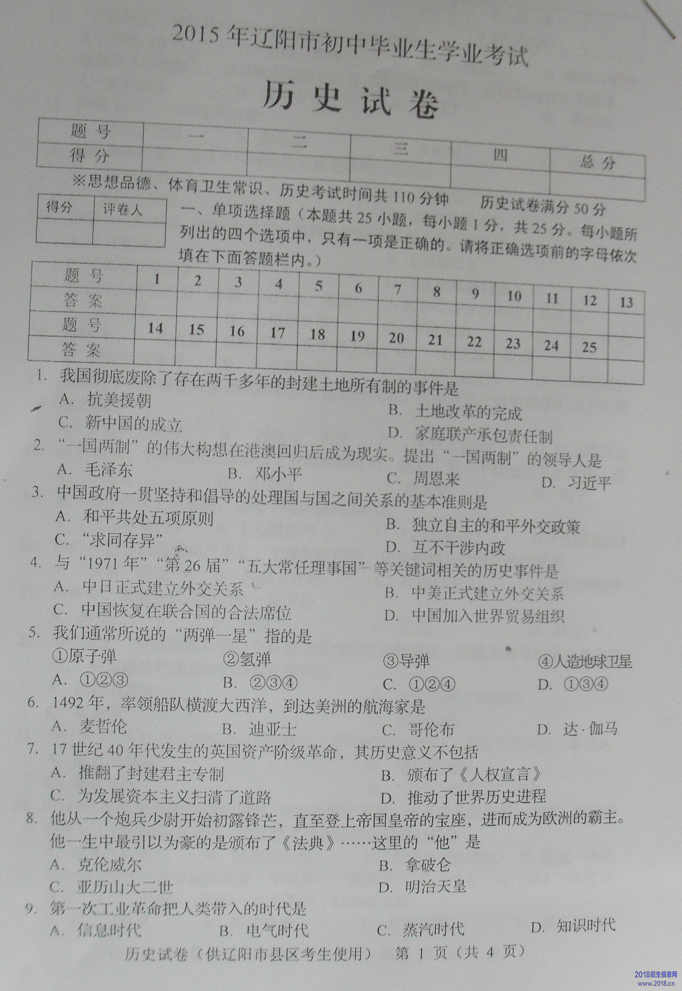 2015年辽宁省辽阳市中考历史试题(扫描版,含答案)