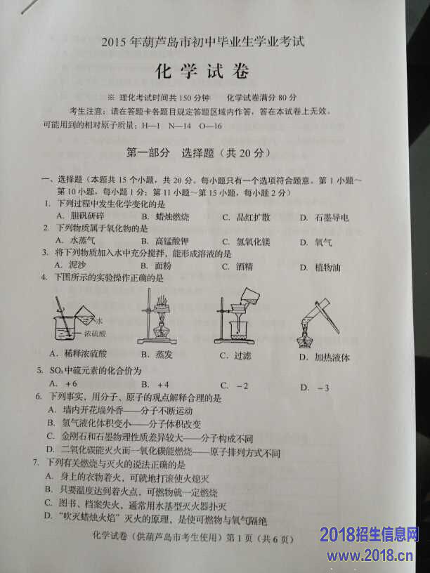 2015年辽宁葫芦岛中考化学试题(图片版,含答案)