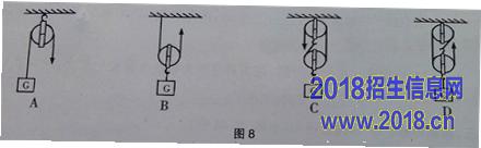 11.用图8所示的滑轮或滑轮组,将同一物体匀速提高h,最省力的是(滑轮重不计)
