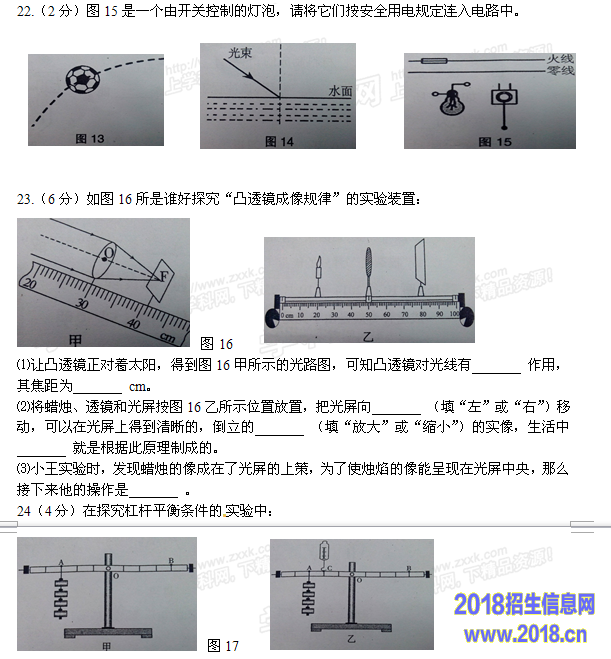 21(2分)一束光线斜射到水面发生反射和折射,请在图14中画出它的反射光线和大致的折射光线。[来源:Zxxk.Com]