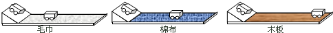 18.在探究“阻力对物体运动的影响”实验中,在水平桌面上铺上粗糙程度不同的物体(如毛巾、棉布、木板等),让小车自斜面顶端静止开始滑下,观察同一小车从同一高度滑下后,在不同表面上运动的距离如图所示。