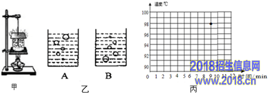 (1)图中是“研究水的沸点”实验,如图乙中A、B所示,其中 图是水沸腾时的气泡的变化情况;当水温升到90℃时,每隔1min记录一次水的温度,在实验中记录了下列的数据。