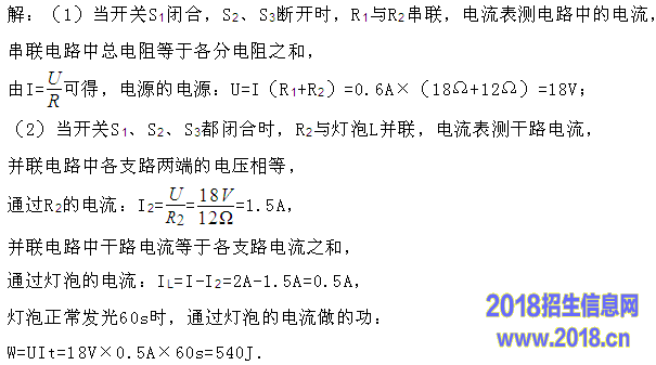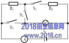24.如图所示电路中,R1=18Ω,R2=12Ω.当开关S1闭合,S2、S3断开时,电流表的示数为0.6A;当开关S1、S2、S3都闭合时,电流表示数为2A,且灯泡正常发光,设电源电压不变。求:
