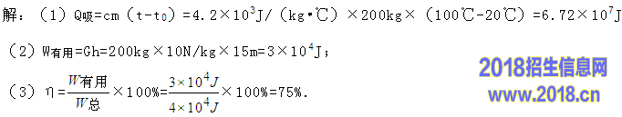 23.用锅炉将200kg的水从20℃加热到100℃,水吸收的热量是多少?如将这些水送到15m高的楼上,对水做的功是多少J?如提水时所做的总功是4×104J,则机械效率是多少?[水的比热容4.2×103J(kg•℃)]